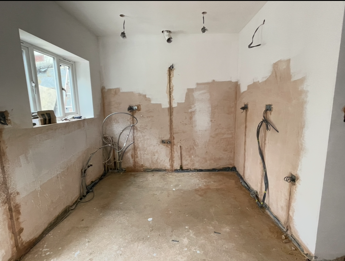 Once the shell of the extension was complete, insulation was installed to the walls, floor, and ceiling to meet current building regulations. This created a warm, energy-efficient space suitable for everyday use. New drainage runs and service connections were introduced at this stage, allowing the kitchen layout to be designed without compromise. First fix electrics and plumbing were then completed, setting out lighting, power, and appliance positions to suit the new layout.